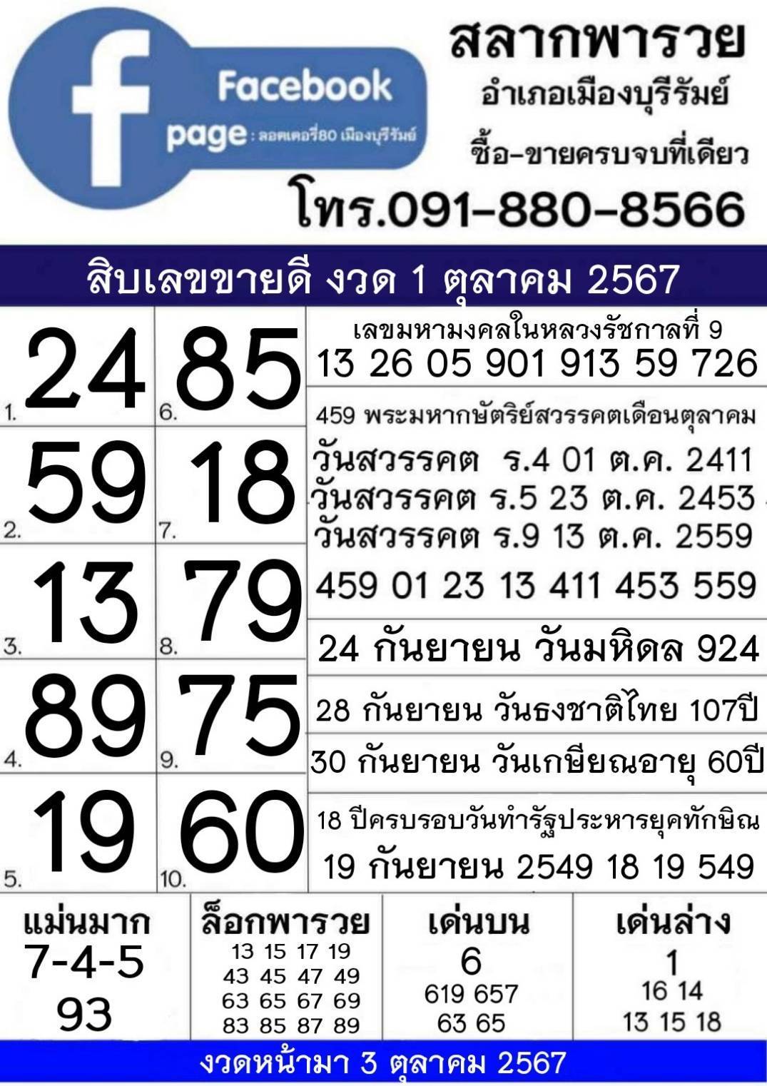 เลขเด็ดสลากพารวย คนบุรีรัมย์เขาซื้อกัน งวด 1 ตุลาคม 2567