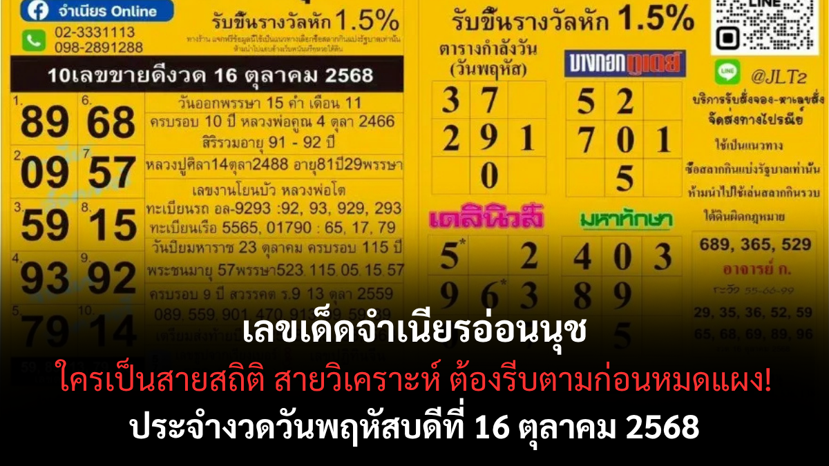 เลขเด็ดจำเนียรอ่อนนุช 16/10/68 รวมเลขดังขายดีทั่วประเทศ ลุ้นรวยพร้อมกันทั่วไทย!