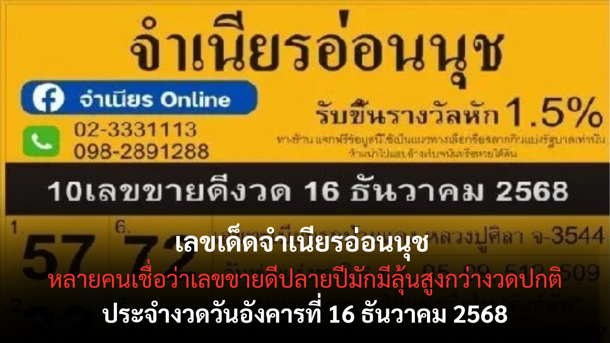 เลขเด็ดจำเนียรอ่อนนุช 16 ธันวาคม 2568 เป็นแนวทางที่คอหวยสายตลาดจริงให้ความสนใจอย่างมาก เพราะ “จำเนียรอ่อนนุช” คือร้านลอตเตอรี่ชื่อดังที่ขึ้นชื่อเรื่องการรวบรวมเลขขายดี เลขเกลี้ยงแผง เลขเด็ด และเลขที่ลูกค้าแห่ซื้อจริงทุกงวด ทำให้โพยนี้กลายเป็นตัวแทนของกระแสหวยจากสนามจริง ล่าสุด เลขเด็ดจำเนียรอ่อนนุช 16/12/68 ได้ถูกพูดถึงอย่างกว้างขวาง หลังมีรายงานว่าเลขหลายชุดถูกจองล่วงหน้าอย่างรวดเร็วตั้งแต่ช่วงต้นงวด