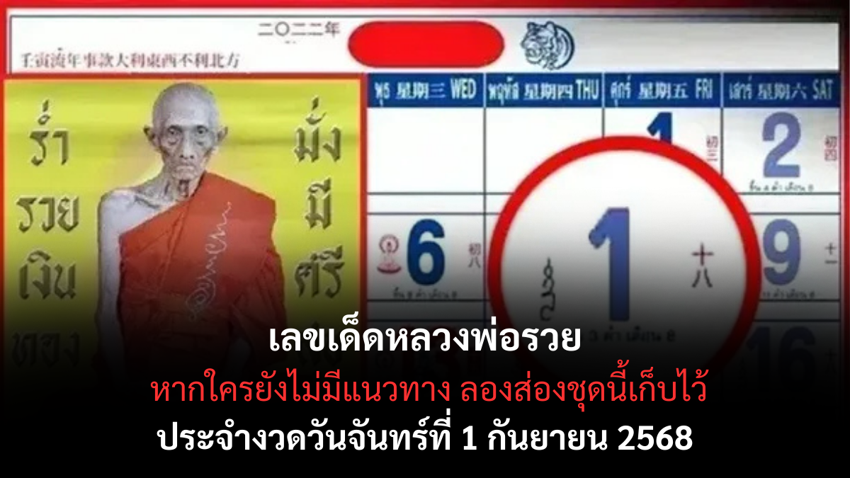 เลขเด็ดหลวงพ่อรวย 1 กันยายน 2568 จากปฏิทินดังของ “หลวงพ่อรวย” กำลังกลายเป็นกระแสร้อนแรงในหมู่คอหวยและนักเสี่ยงโชคทั่วประเทศ เพราะแต่ละงวดที่ผ่านมา มีตัวเลขที่ตรงใจและใกล้เคียงกับผลสลากกินแบ่งรัฐบาลหลายครั้ง ทำให้ในงวดนี้ผู้คนต่างจับตาและแห่ส่องกันอย่างคึกคัก กระแสเลขเด็ด “หลวงพ่อรวย” ถูกพูดถึงอย่างมาก เลขเด็ด ในโลกโซเชียล เลขเด็ดหลวงพ่อรวย 1/9/68 เนื่องจากความแม่นยำที่สร้างความมั่นใจให้กับเหล่านักเสี่ยงโชค โดยเฉพาะงวดนี้ที่มีเลขเด่นชัดหลายชุด ทั้งเลข 2 ตัว และเลข 3 ตัว ที่ถูกคอหวยนำไปตีความและใช้เป็นแนวทางเสี่ยงโชค ไม่ว่าจะซื้อ หวยรัฐบาล หวยใต้ดิน หรือหวยออนไลน์ ก็ล้วนแต่หวังว่าจะได้โชคใหญ่