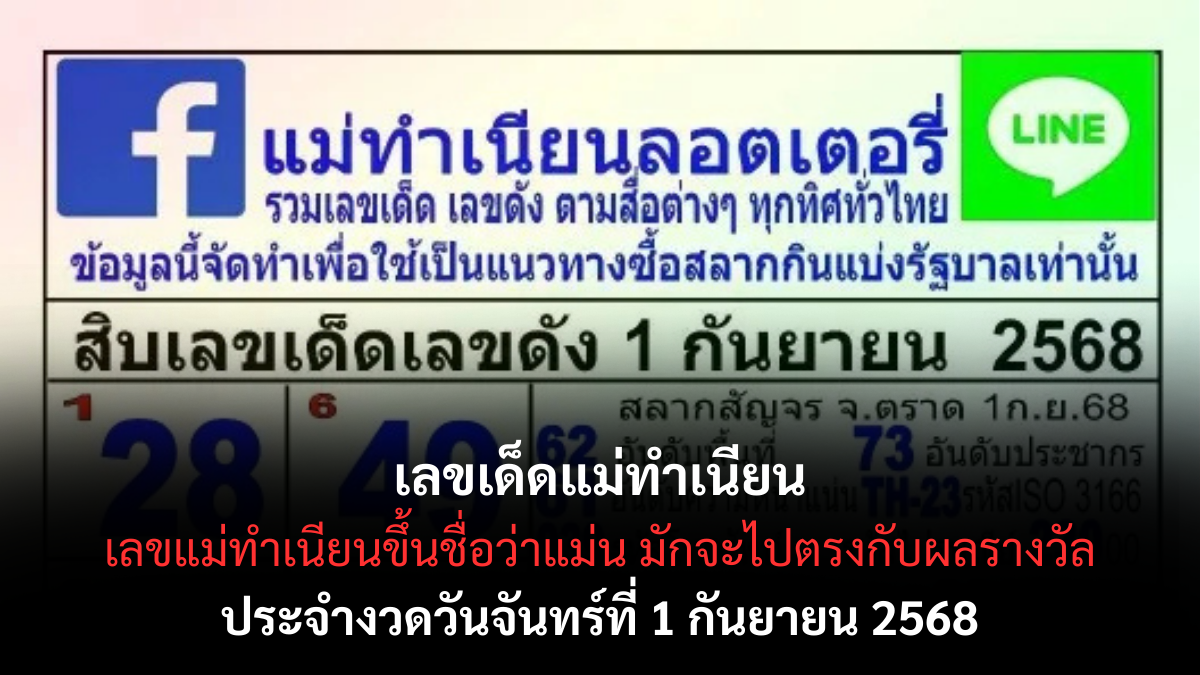 เลขเด็ดแม่ทำเนียน 1 กันยายน 2568 จาก “แม่ทำเนียน” ถือเป็นอีกหนึ่งแนวทางหวยที่คอหวยทั่วประเทศรอคอย เพราะทุกงวดจะมีการจัดอันดับ “10 เลขดังขายดี” ให้กับบรรดานักเสี่ยงโชคได้เก็บไว้ใช้เป็นแนวทางซื้อสลากกินแบ่งรัฐบาล ซึ่งในงวดนี้กระแสแรงจนหลายตัวเลขเริ่มหาซื้อยาก แผงลอตเตอรี่หลายแห่งถึงกับบอกว่า เลขเด็ด “หมดเกลี้ยงตั้งแต่ต้นงวด” เลยทีเดียว เลขเด็ดแม่ทำเนียน 1/9/68 เลขแม่ทำเนียนขึ้นชื่อว่าแม่น เพราะมักจะไปตรงกับผลรางวัล หรืออย่างน้อยก็ใกล้เคียงในหลายงวด
