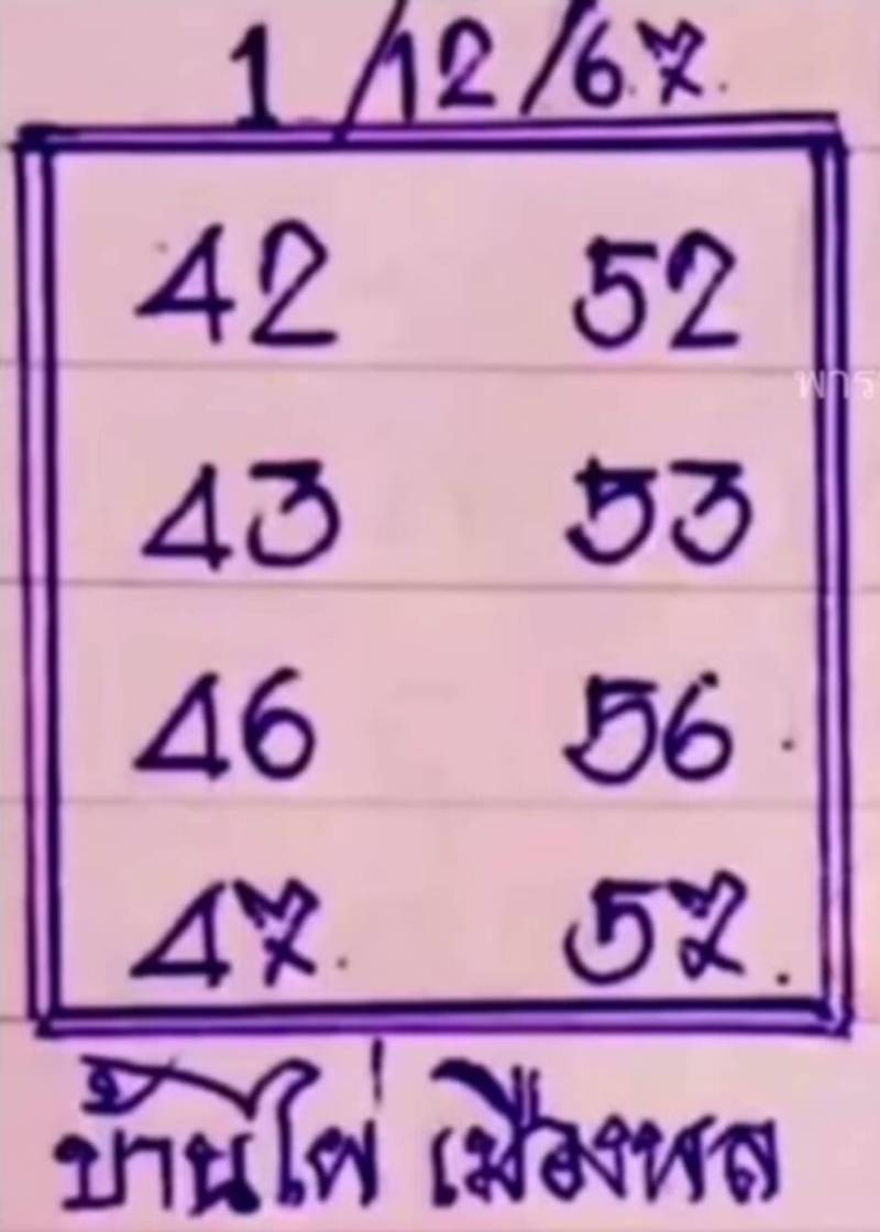 - เลข 2 ตัว : 42 – 43 – 46 – 47 , 52 – 53 – 56 – 57